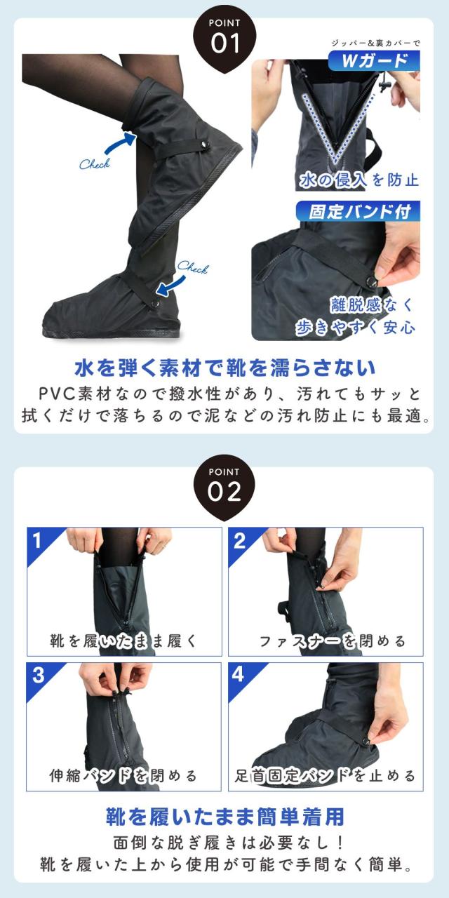 前面には止水ファスナーを採用し、着脱がとても簡単。靴を履いたままサッと装着できるため、急な雨にもスピーディーに対応可能です。長靴のように履き替える手間もなく、靴を濡らさずに快適に過ごせます。