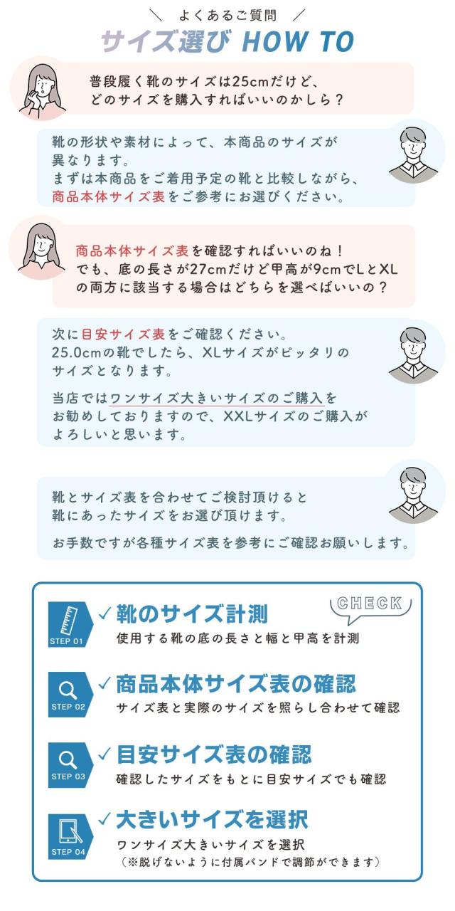 S〜XXXLまでの7サイズ展開で、21.5cm〜28.0cmまで幅広く対応。キッズから大人まで男女兼用でご使用いただけます。メンズ、レディース問わず使えるユニセックスデザインで、家族全員分を揃えておくのもおすすめ。ぴったりフィットしてずれにくく、しっかり防水できる設計です。