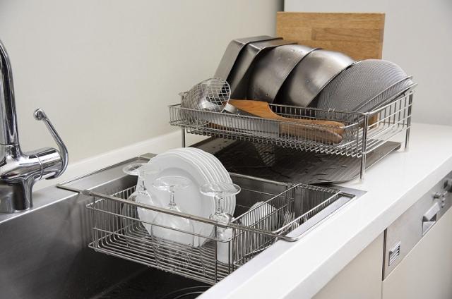 水切りかごが置かれるシンク脇は本来、作業台として使うスペース。ここを広く取りたいという人は多いはずです。