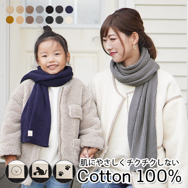 秋冬の防寒に◎犬猫好きさんにおすすめのラベルがついたコットン100%のマフラーです!シンプルなラベル無しもお選びいただけます。サイズはフリー&キッズサイズの2サイズ展開。コットン100%素材ながら程よく厚手で暖かくふんわりボリューミー。アクリルやウールの静電気やチクチク感が苦手な方にも◎シンプルでベーシックなカラーを揃えているので様々なファッションに合わせやすい。お友達へのプレゼント等にもおすすめ!メール便送料無料でお届けいたします♪