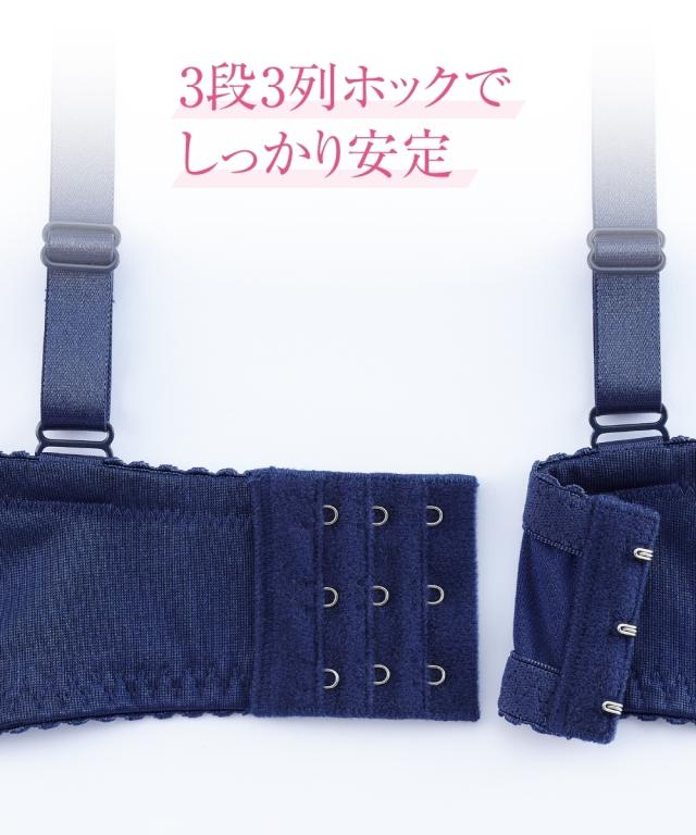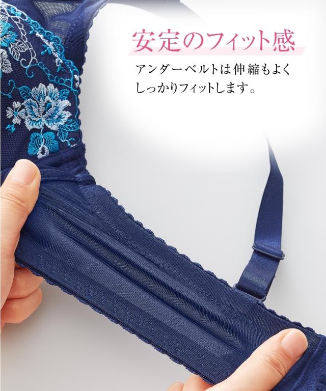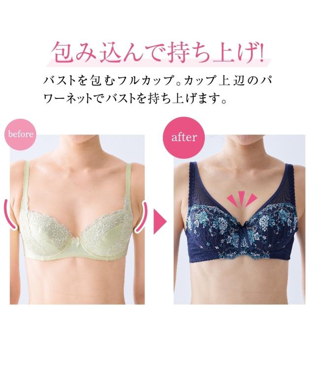カップ上のパワーネットがバストをグッと持ち上げ、カップはソフトで心地よいウレタンシート。洗濯しても型くずれしにくい丈夫なつくりです。E/Fカップはアンダー105cmまで対応。