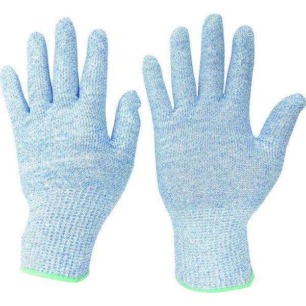 ・色:ブルー・サイズ:M・全長(cm):19.0・手のひら周り(cm):17.0・中指長さ(cm):7.2・厚さ(mm):1.2・ゲージ数:10・EN388 2003規格:カットレベル:5(参考値)・リストカラー:グリーン・すべり止め:無し・耐切創レベル:X/F