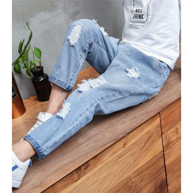 子供服 デニム 長ズボン 春秋 女の子 ジーンズ ダメージパンツ ハイウエスト カジュアル ロングパンツ 可愛い きれいめ 入学式