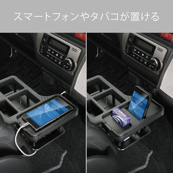 ハイエース専用設計のドリンクテーブル。細缶から500mm紙パック飲料が入るドリンクホルダーが2か所、最新のスマートフォンを置くことができるトレイを備えています。