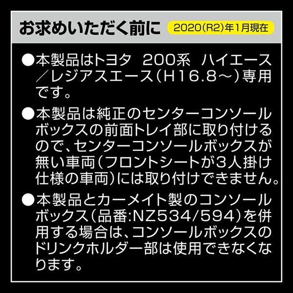 ・当社製品ハイエース用コンソールボックス(品番:NZ534・NZ594)と併用可能ですが、コンソールボックス側のドリンクホルダー部は使用できなくなります。予めご了承ください。