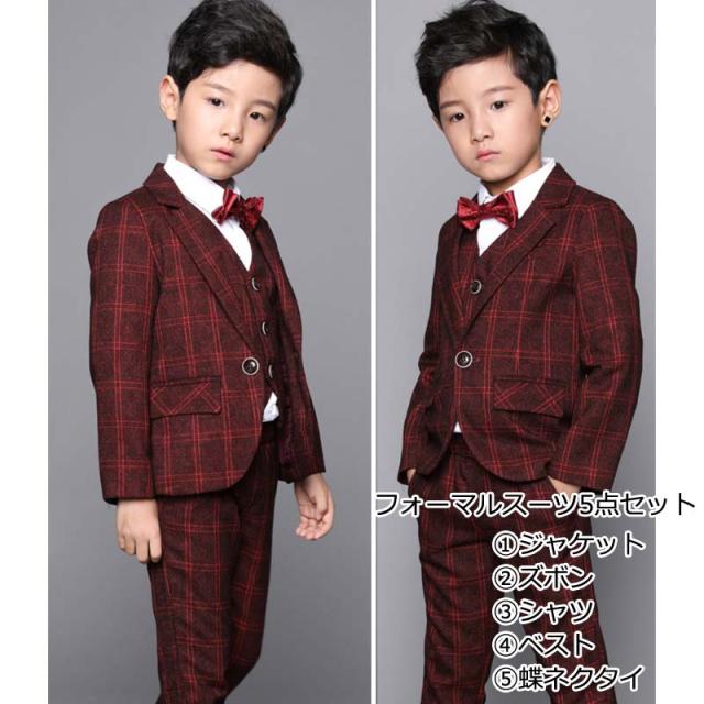 子供スーツ 5点セット チェック柄 子供 フォーマルスーツ レッド グレー 七五三 発表会 演奏会 入学式 卒業式 入園式 スーツ こどもスーツキッズ 子供 スーツ 男の子スーツ キッズ ジュニア ベビースーツ