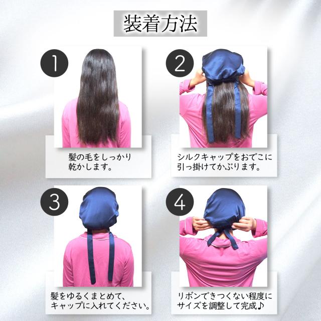 - ?髪を手でまとめる →ロングですが、まとめたら入りました ?おでこから被る ?はみ出てる毛を入れる ?リボンを結ぶ →緩めだと朝取れてました!ぴったりめだと被ったままでした! ?次の日サラサラ?