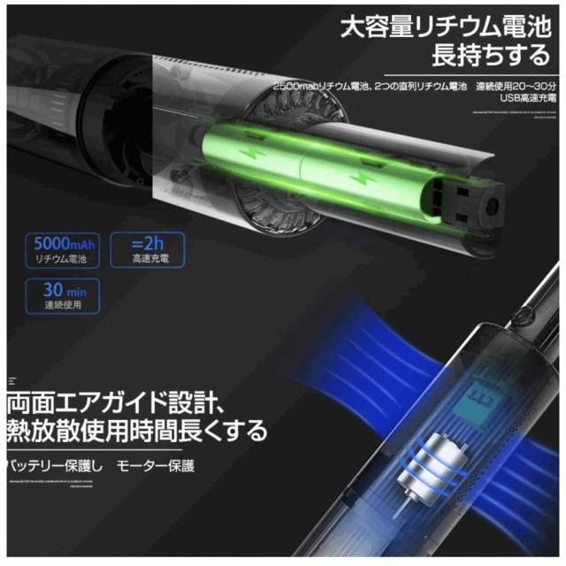 - 車用のクリーナーの買い替えです。ありがちの形がイヤでスタイリッシュなこちらを購入しました。クーポンやポイントでとてもお安く購入できました。吸引力は価格なりかなと思いますが充分使用できます。