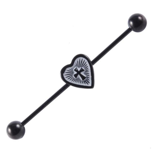 16ゲージの黒色の長いロングストレートバーベルにハートの中に光り輝く十字架をデザインしたおしゃれなインダストリアル用ボディピアス。
