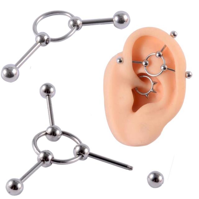 ステンレス製の18Gのストレートバーベルに16Gのキャプティブビーズリング(CBR)をセットしたスレイブバーベルに穴あきのボールをセットした18ゲージのストレートバーベルを2本を通したダブルバーベルタイプと3本を通したトリプルバーベルタイプのインダストリアル用ボディーピアス。