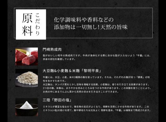 牛肉発酵調味料(牛肉(国産)、醤油麹(小麦・大豆を含む)、米麹)、食塩、砂糖、でんぷん/アルコール