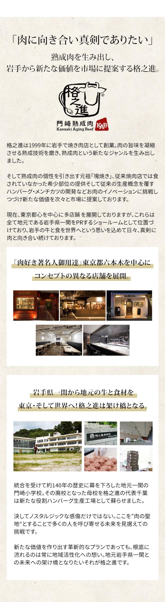 格之進ではハンバーグの為だけに仕入れた5種類の部位(ロース、肩、バラ、モモ、スネ)を使用しており、「早く溶け出す脂」、「食べる時まで肉に残る脂」など部位ごとの特長を考慮して、焼き上がりの状態から逆算した理想のバランスで肉を配合してます。