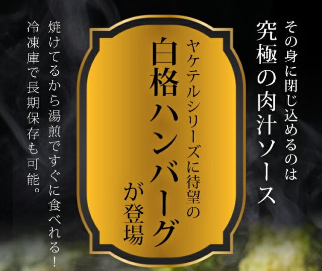 | 商品 | ヤケテル白格ハンバーグ…黒毛和牛と白金豚のハイクオリティブレンドのジューシーなまろみのあるハンバーグです。白格ハンバーグは「黒毛和牛」と「白金豚」を使用した合挽きハンバーグです。 黒格ハンバーグに比べ、比較的あっさりとした味わいで、特に女性の方に人気のある商品です。通常品と異なり焼成済みですので、湯煎するだけで食べることができます。BBQでも生焼けの心配もなく炭火で温めて二度焼きも美味♪ |