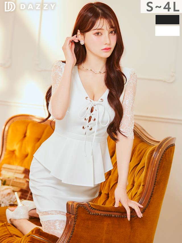 ワンランク上の女性に魅せるレースアップデザインのタイトミニドレス。チラリと覗く胸元がセクシーに♪気になるぷにぷに二の腕を可愛く隠すレース袖◎ペプラムはポッコリお腹を隠してくれます!スカート裾にもレースを施し大人の色気溢れる一着に。