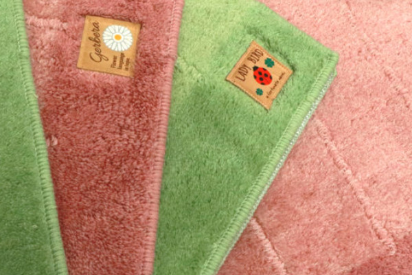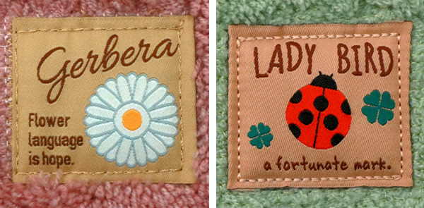 ピンクにはガーベラ、グリーンにはてんとうむしの可愛らしいタグが付いています。