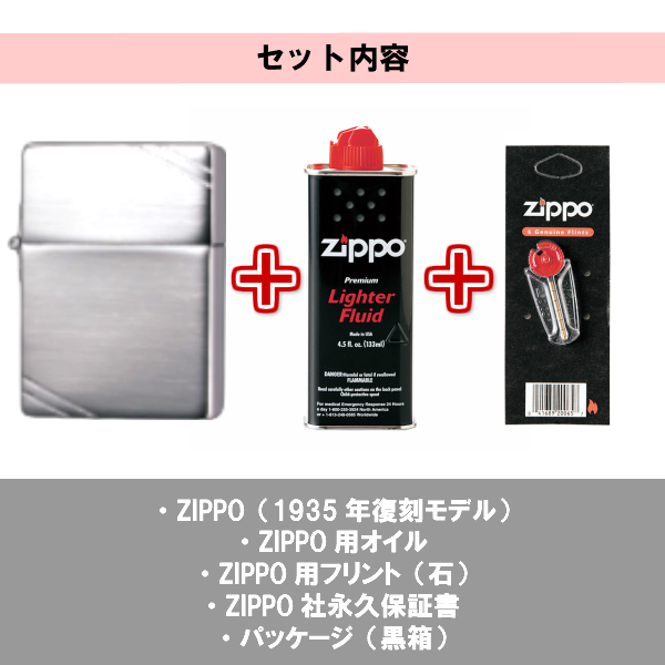 1935年に製造されていたZIPPOの復刻モデルのオイルとフリントが付いたセットです。