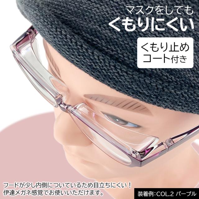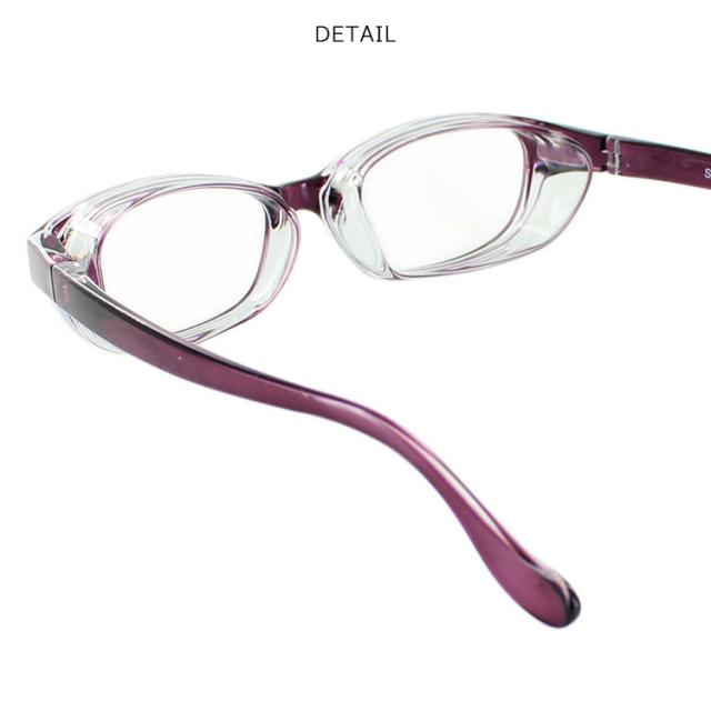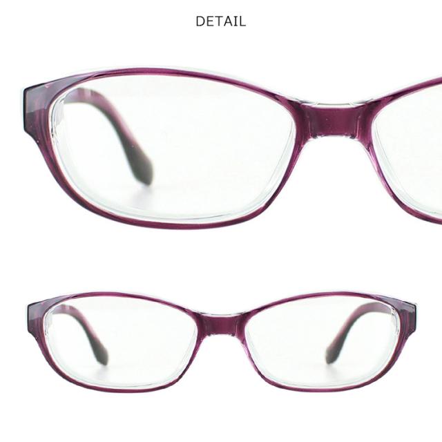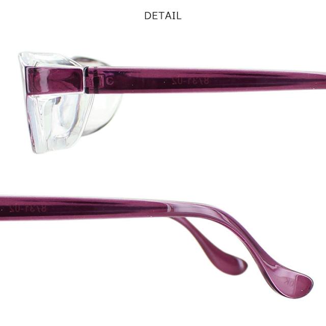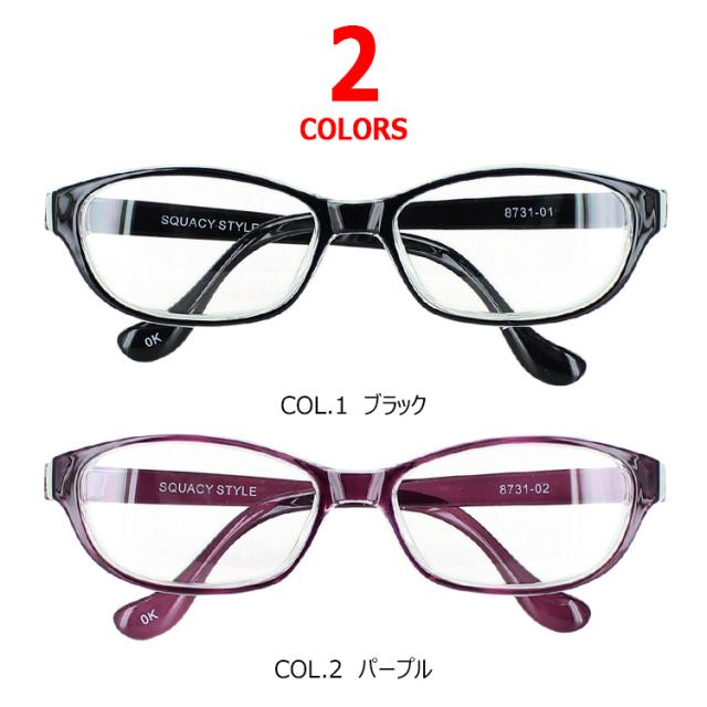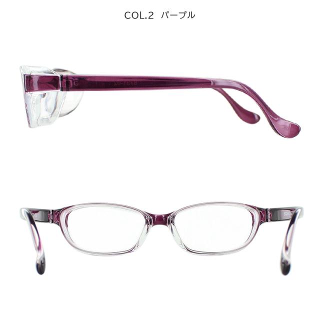 | ●フレームカラー(全2色) COL.1 ブラック COL.2 パープル ●レンズカラー(共通) クリア | レンズ枠素材:プラスチック テンプル素材:プラスチック レンズ素材:プラスチック ●仕様 紫外線99%カット 可視光線透過率94% |