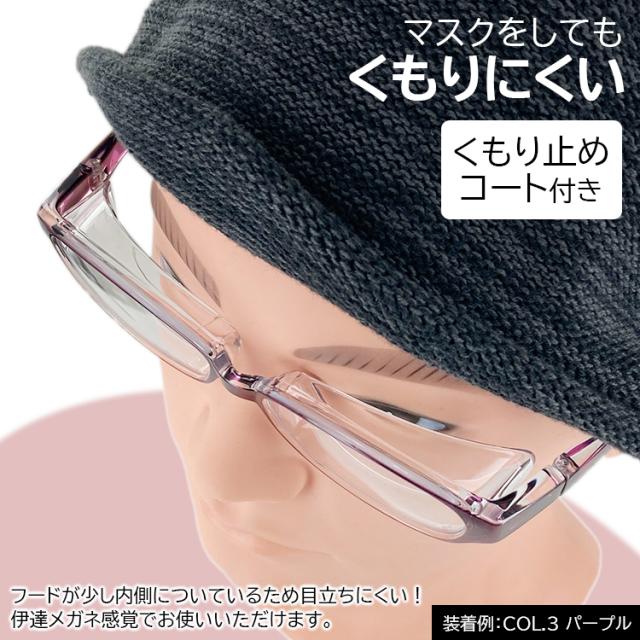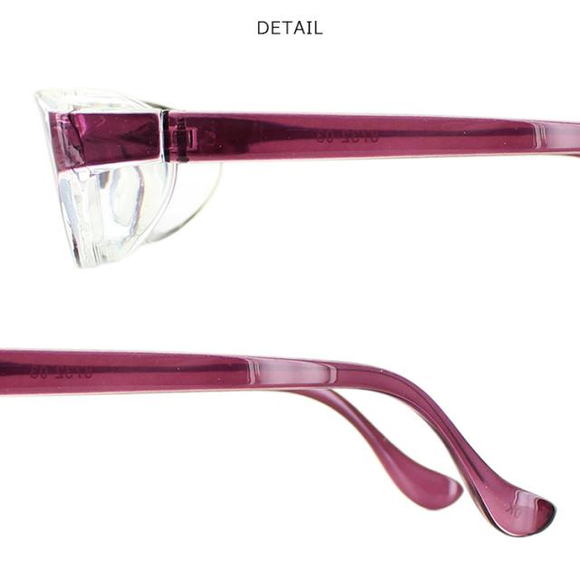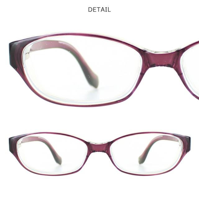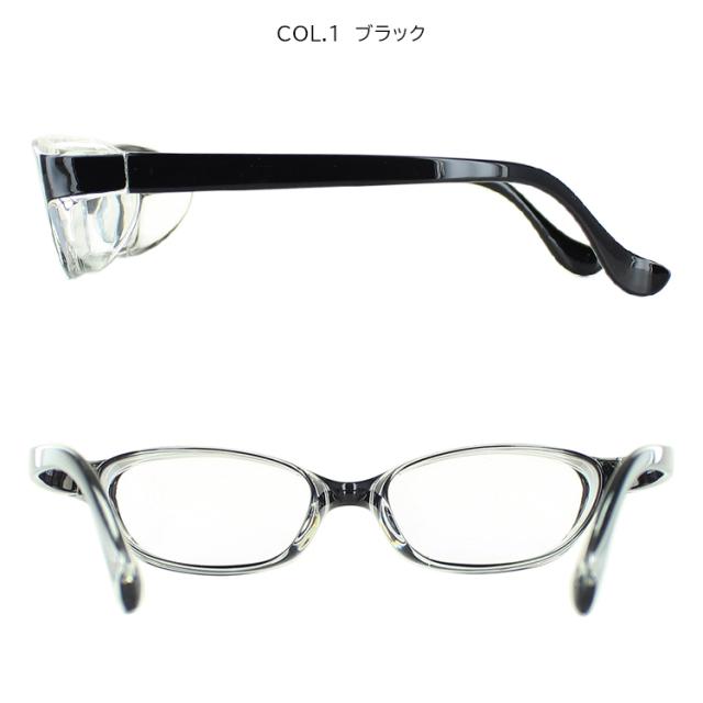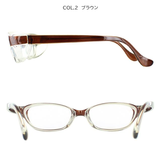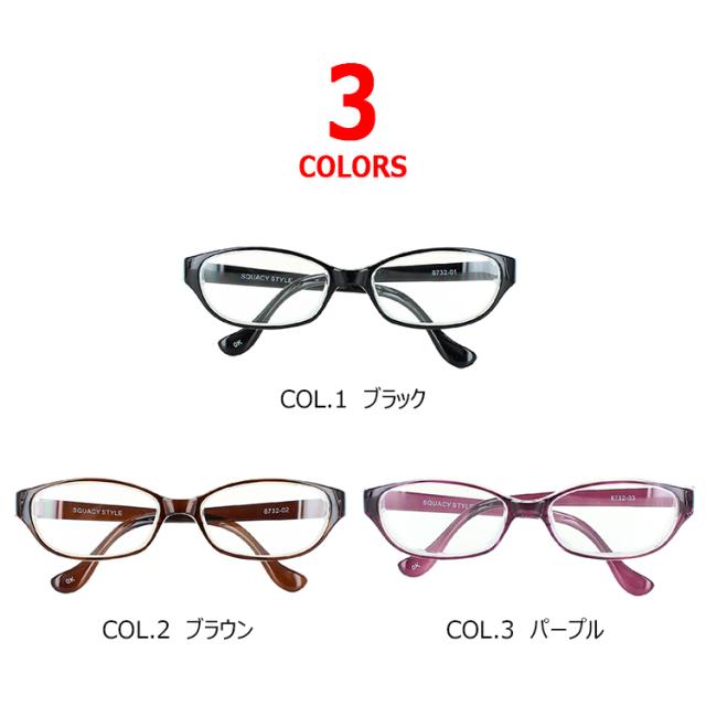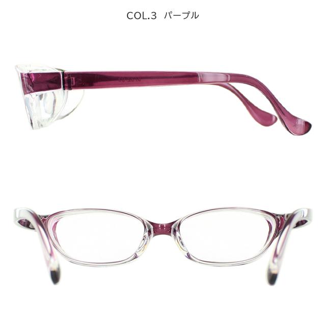 | ●フレームカラー(全3色) COL.1 ブラック COL.2 ブラウン COL.3 パープル ●レンズカラー(共通) クリア | レンズ枠素材:プラスチック テンプル素材:プラスチック レンズ素材:プラスチック ●仕様 紫外線99%カット 可視光線透過率94% |