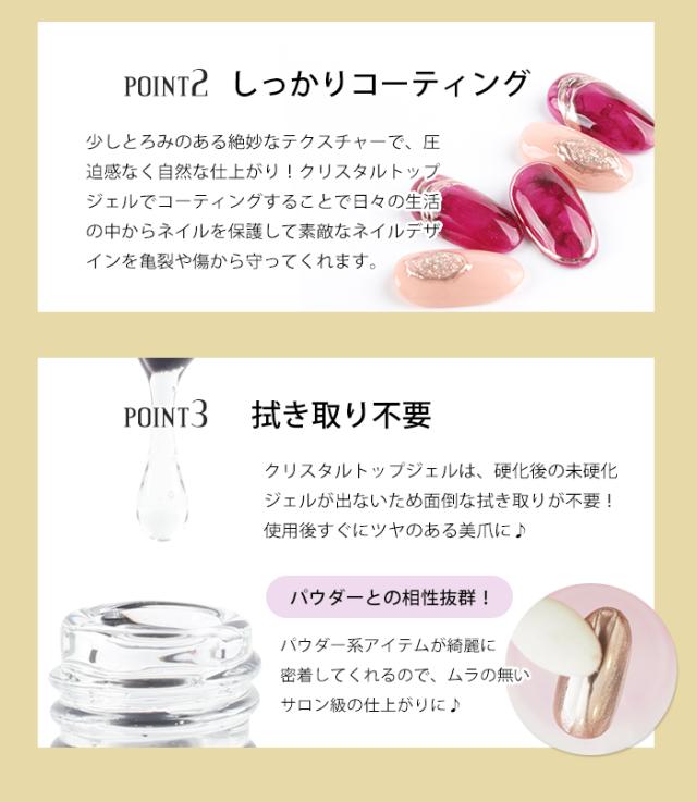 | 商品説明 | クリスタルトップジェルで仕上げることで 透明感のあるツヤがしっかり持続! 未硬化ジェルのふき取り不要で 少しとろみのある絶妙なテクスチャー♪ パウダー系アイテムとも相性抜群です!! |