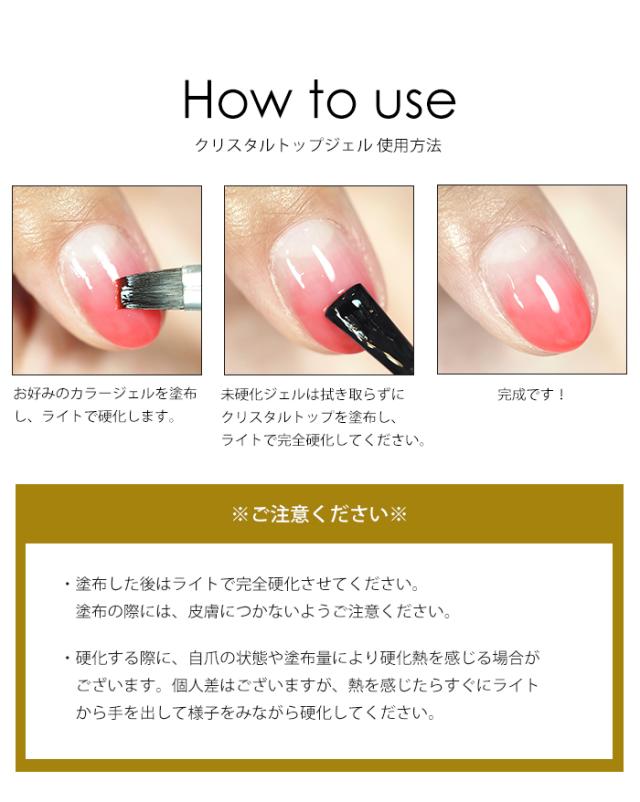 ・ジェルネイルの仕上げに塗布し、完全硬化させてください