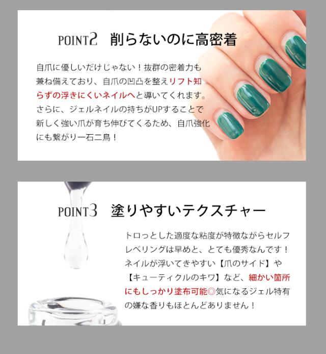 | 商品説明 | 自爪へのダメージを軽減! サンディング不要のベースジェルが誕生!! 塗りやすいテスクチャーで 抜群の密着性◎ 甘皮処理をすることで さらにベースの持ちに差がつきます♪ |