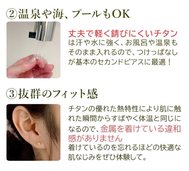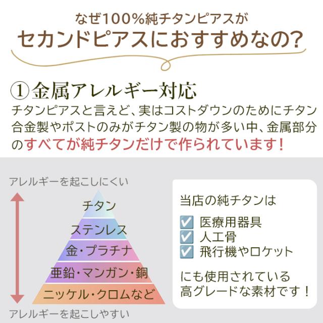 | あり 純チタン製 ※純チタンは被膜により表面が大変滑らかなため、ステンレス等に比べるとキャッチがゆるめになります。 セカンドピアスとしてつけっぱなしにされる方や心配な方は、別売りの「落ちないキャッチ」をご利用ください。 →落ちないキャッチはこちら |