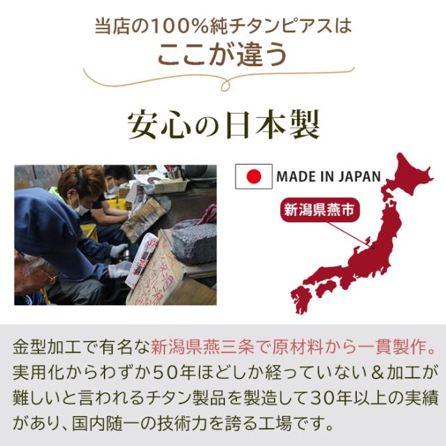 「チタンピアス」と言えど、実はチタン合金製だったり、ポストなど一部のみがチタン製な物が増えている中、40年にわたる実績があり海外でも高い評価を得ている新潟県燕市の100%純チタンピアス。