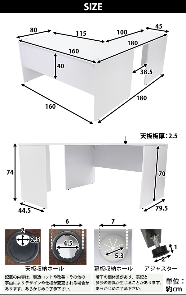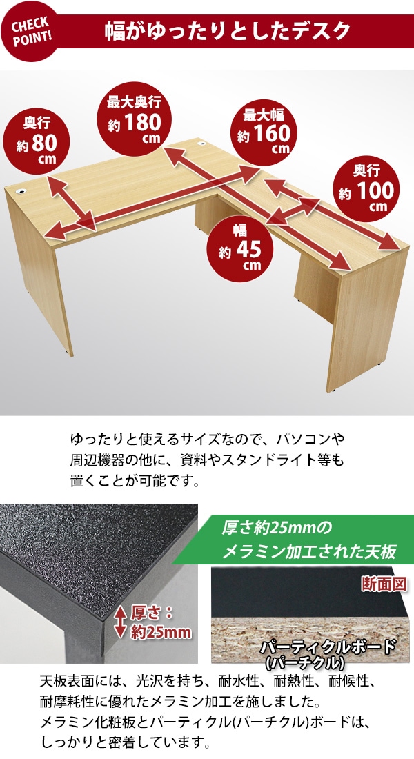 | 材質 | パーティクル(パーチクル)ボード(メラミン加工)(本体、サイドデスク)、プラスチック(アジャスター、配線収納ホール) |