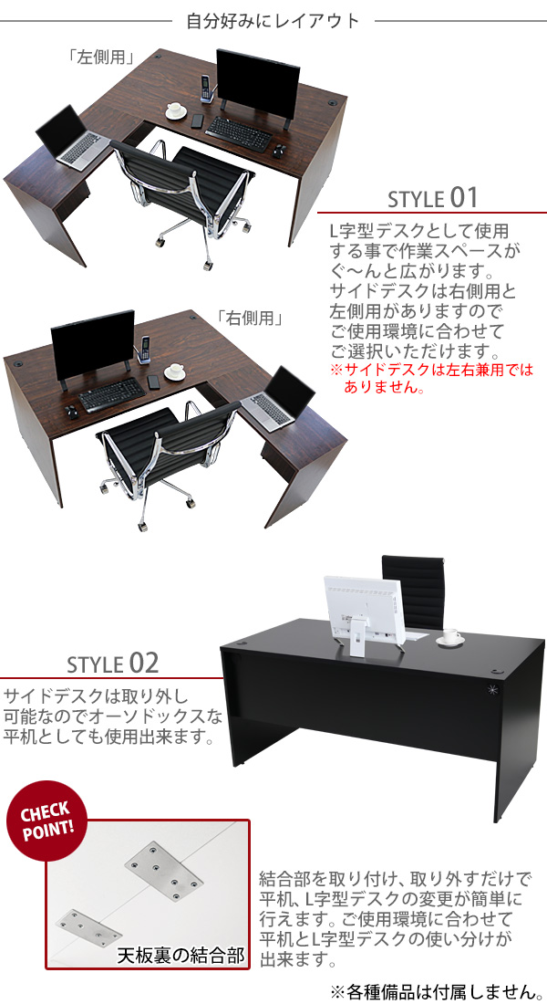 | ■作業スペースを広く確保出来る、L字型ワークデスクです。 ■サイドデスクの幅が約45cmのタイプです。 ■会議室や事務所等、オフィス家具として様々なシーンでお使いいただけます。 ■天板には、メラミン加工を施しています。 ■幕板が天板と側面板をがっちりと固定!横揺れを防止します。 ■ネジ穴隠しのシール付き。 ■デスクの天板と幕板に配線収納ホールが2カ所ずつ備わっています。 ■アジャスターで高さの調節が可能です。(高さ調節範囲〜約15mm) ※こちらの商品は、組立て式です。組立てにはプラスドライバーが必要です。お客様でご用意ください。 ※組立図が付属します。 ※サイドデスクの設置個所をご確認のうえご注文ください。 ■材質:パーティクル(パーチクル)ボード(メラミン加工)(本体、サイドデスク)、プラスチック(アジャスター、配線収納ホール) ■重量:約60kg(デスク:44kg、サイドデスク:16kg) ■総耐荷重:約80kg ●新品商品ではありますが、輸入商品の為、多少の擦り傷などがある場合がございますので、ご納得の上ご購入下さいませ。 ●ご購入後、お客様ご都合によるご返品、ご返金等は一切お受け致しておりません。 ●本商品を使用した際に発生したトラブル、事故につきまして、当社は一切の責任を負いません。ご使用に関しましては、全て自己責任にてお願い致します。 |