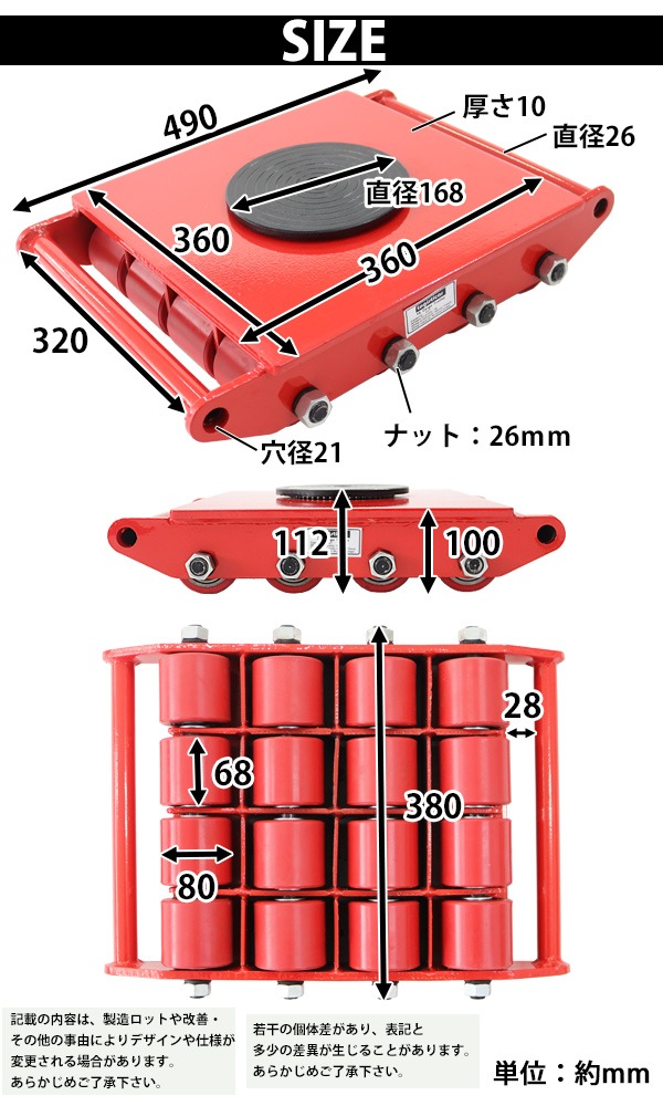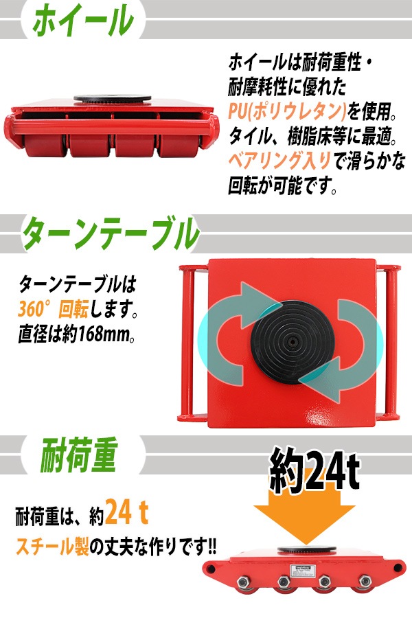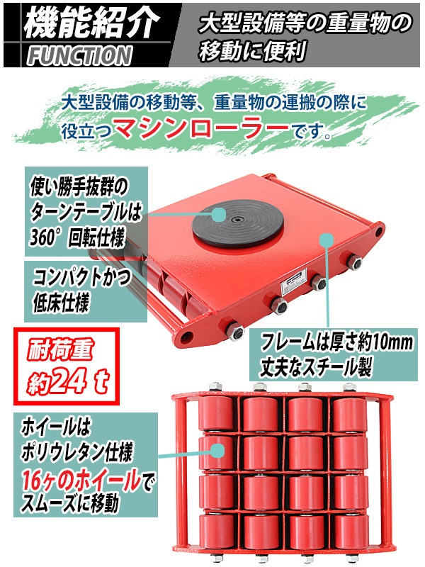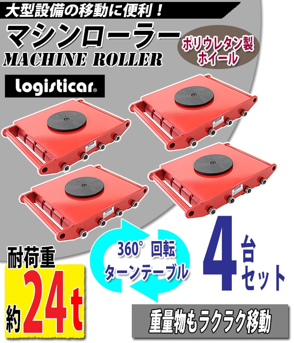 マシンローラー 耐荷重約24t ポリウレタン製ホイール 4台 4台セット 360° ターンテーブル 回転台 運搬ローラー 運搬マシンローラー 重量物 低床 ポーター 赤 コロ車 ウレタンローラー 搬入 搬出 運搬車 台車 キャリー マシーン ローラー 引越 レッド roller24tp4