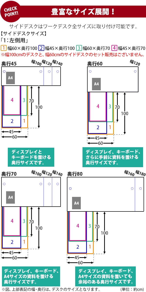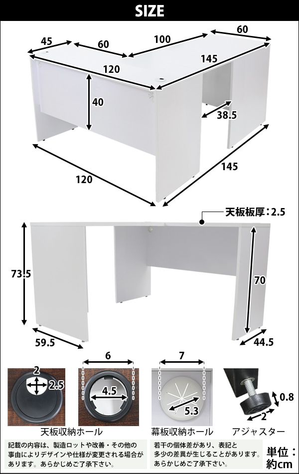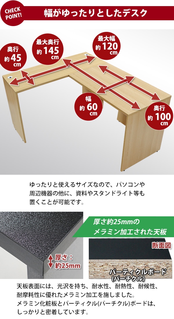 | 材質 | パーティクル(パーチクル)ボード(メラミン加工)(本体、サイドデスク)、プラスチック(アジャスター、配線収納ホール) |