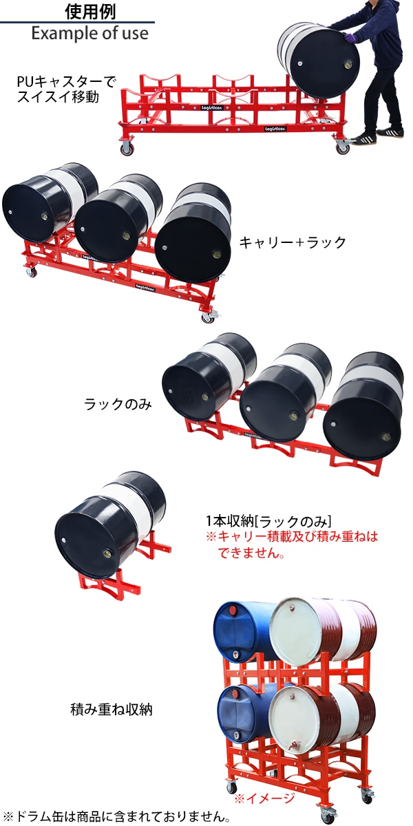 ドラム缶ラック キャリー付き 耐荷重約1.5t 約1500kg 3本収納 赤 積み重ね ドラム缶運搬車 ドラム缶スタンド ドラムキャリー ドラムラック ドラムスタンド ドラム缶横置き 横積み ドラム缶 スタンド ラック 運搬 運送 保管 レッド drumrucky150