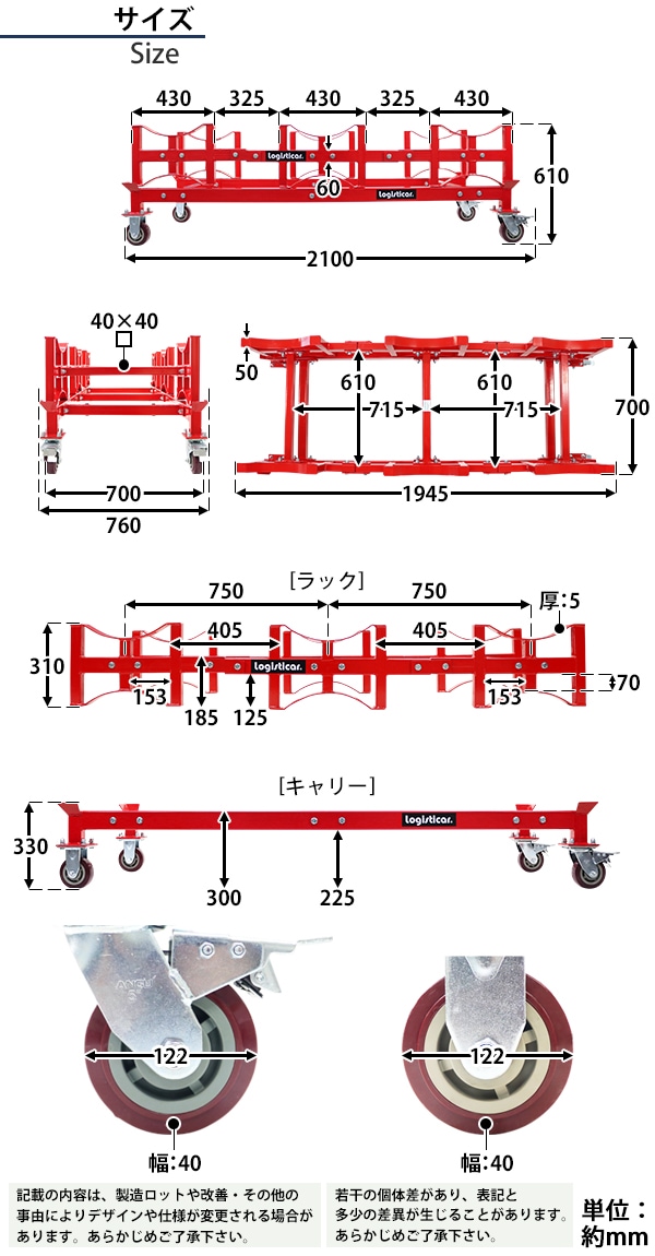 | 梱包サイズ (2個口) | ラック:約W800×約D690×約H150(mm) キャリー:約W2100×約D330×約H210(mm) |