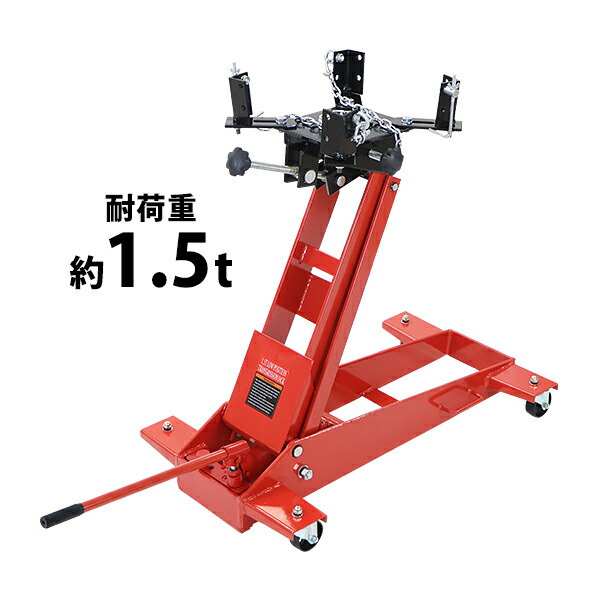 油圧式 トランスミッションジャッキ フロアタイプ レッド 耐荷重約1.5t 約1500kg ミッションジャッキ ミッションリフト 低床タイプ 高さ調節 角度調節 左右位置調節 引っ掛け棒付 キャスター付 ミッション 脱着 交換 メンテナンス 整備 昇降 車 赤 tmjackt30315tr