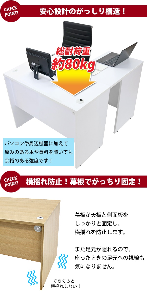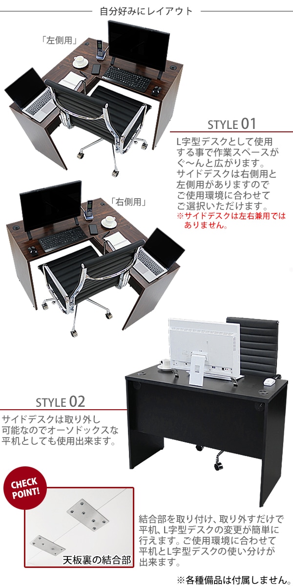 | ■作業スペースを広く確保出来る、L字型ワークデスクです。 ■サイドデスクの幅が約45cmのタイプです。 ■会議室や事務所等、オフィス家具として様々なシーンでお使いいただけます。 ■天板には、メラミン加工を施しています。 ■幕板が天板と側面板をがっちりと固定!横揺れを防止します。 ■ネジ穴隠しのシール付き。(サイドデスクのみ付属) ■デスクの天板と幕板に配線収納ホールが2カ所ずつ備わっています。 ■アジャスターで高さの調節が可能です。(高さ調節範囲〜約15mm) ※こちらの商品は、組立て式です。組立てにはプラスドライバーが必要です。お客様でご用意ください。 ※組立図が付属します。 ※サイドデスクの設置個所をご確認のうえご注文ください。 ■材質:パーティクル(パーチクル)ボード(メラミン加工)(本体、サイドデスク)、プラスチック(アジャスター、配線収納ホール) ■重量:約32kg(デスク:19kg、サイドデスク:13kg) ■総耐荷重:約80kg ●新品商品ではありますが、輸入商品の為、多少の擦り傷などがある場合がございますので、ご納得の上ご購入下さいませ。 ●ご購入後、お客様ご都合によるご返品、ご返金等は一切お受け致しておりません。 ●本商品を使用した際に発生したトラブル、事故につきまして、当社は一切の責任を負いません。ご使用に関しましては、全て自己責任にてお願い致します。 |