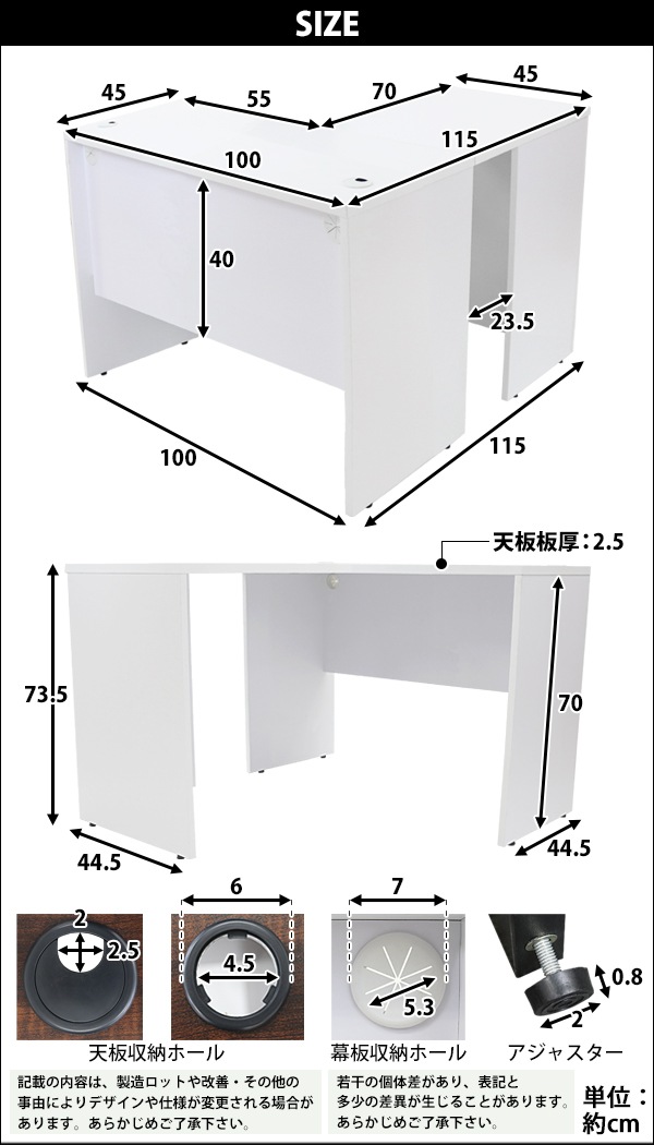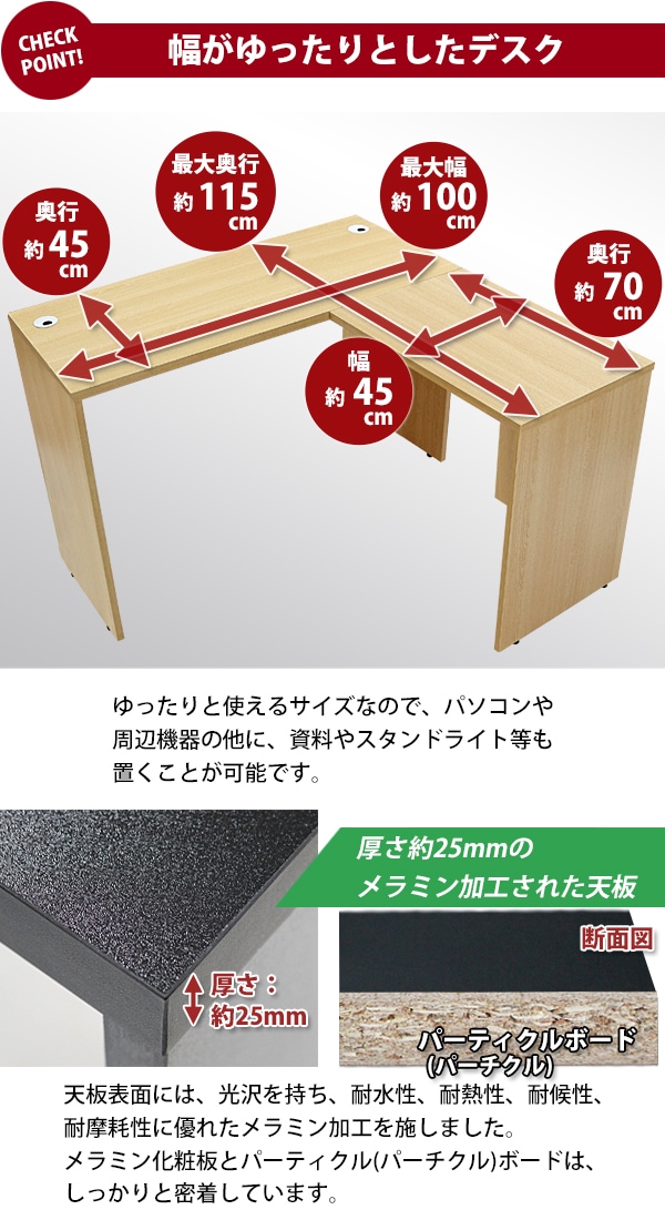 | 材質 | パーティクル(パーチクル)ボード(メラミン加工)(本体、サイドデスク)、プラスチック(アジャスター、配線収納ホール) |