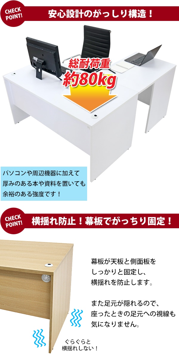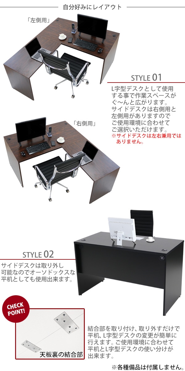 | ■作業スペースを広く確保出来る、L字型ワークデスクです。 ■サイドデスクの幅が約60cmのタイプです。 ■会議室や事務所等、オフィス家具として様々なシーンでお使いいただけます。 ■天板には、メラミン加工を施しています。 ■幕板が天板と側面板をがっちりと固定!横揺れを防止します。 ■ネジ穴隠しのシール付き。(サイドデスクのみ付属) ■デスクの天板と幕板に配線収納ホールが2カ所ずつ備わっています。 ■アジャスターで高さの調節が可能です。(高さ調節範囲〜約15mm) ※こちらの商品は、組立て式です。組立てにはプラスドライバーが必要です。お客様でご用意ください。 ※組立図が付属します。 ※サイドデスクの設置個所をご確認のうえご注文ください。 ■材質:パーティクル(パーチクル)ボード(メラミン加工)(本体、サイドデスク)、プラスチック(アジャスター、配線収納ホール) ■重量:約56kg(デスク:35kg、サイドデスク:21kg) ■総耐荷重:約80kg ●新品商品ではありますが、輸入商品の為、多少の擦り傷などがある場合がございますので、ご納得の上ご購入下さいませ。 ●ご購入後、お客様ご都合によるご返品、ご返金等は一切お受け致しておりません。 ●本商品を使用した際に発生したトラブル、事故につきまして、当社は一切の責任を負いません。ご使用に関しましては、全て自己責任にてお願い致します。 |