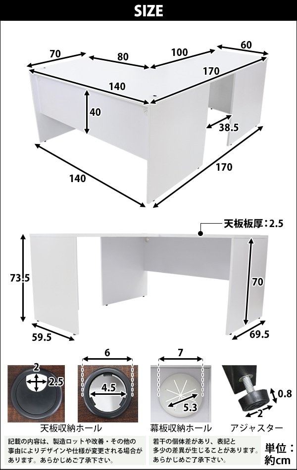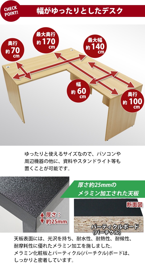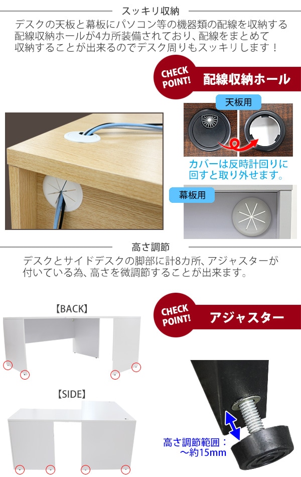| 材質 | パーティクル(パーチクル)ボード(メラミン加工)(本体、サイドデスク)、プラスチック(アジャスター、配線収納ホール) |