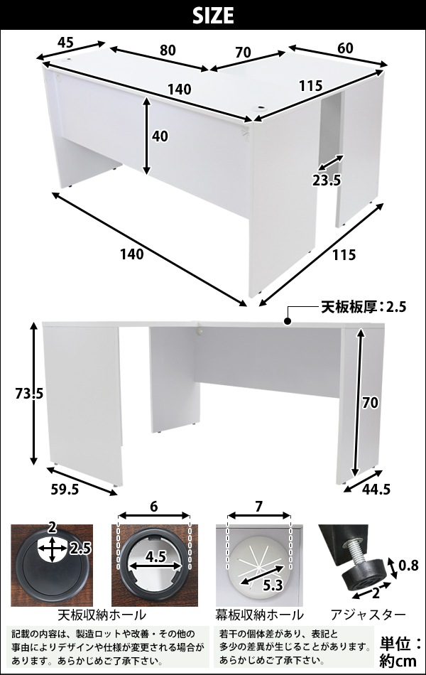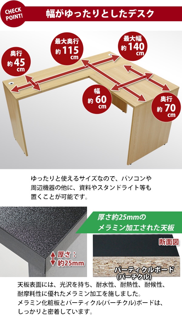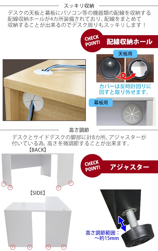 | 材質 | パーティクル(パーチクル)ボード(メラミン加工)(本体、サイドデスク)、プラスチック(アジャスター、配線収納ホール) |