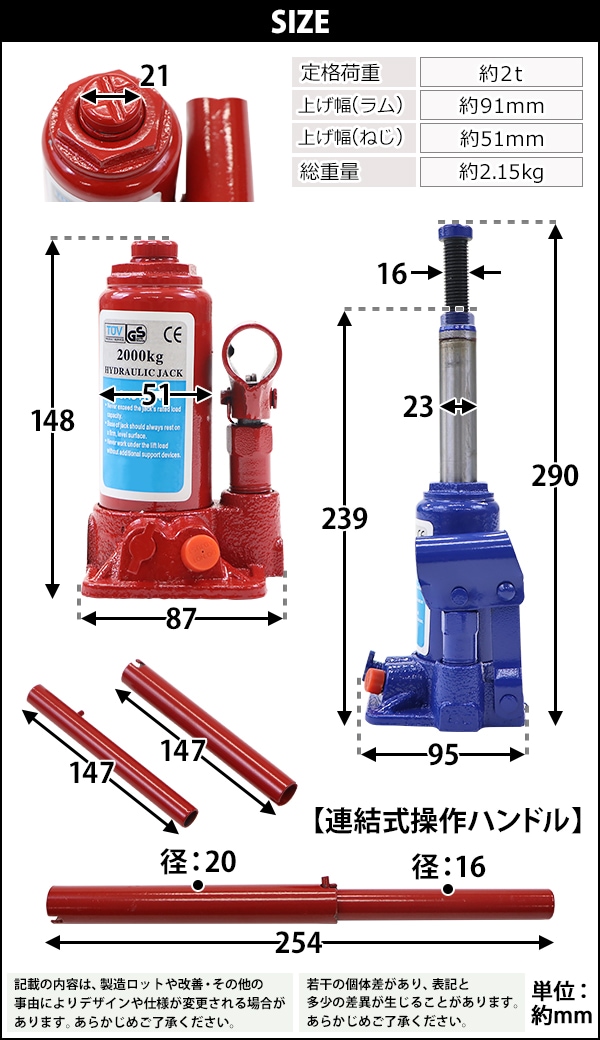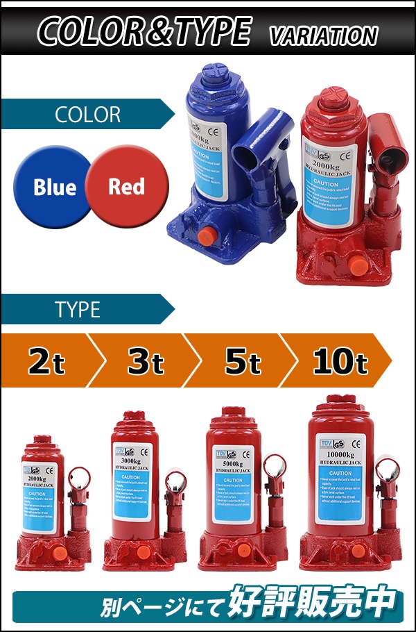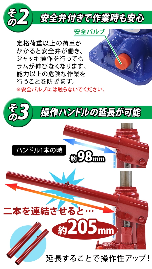 選べる2カラー 油圧式 ボトルジャッキ 定格荷重約2t 約2.0t 約2000kg 1台 単品 油圧ジャッキ だるまジャッキ ダルマジャッキ ジャッキ 手動 安全弁付き ジャッキアップ タイヤ交換 工具 小型 軽量 車載用 車 整備 修理 メンテナンス 建設 工場 作業 bjackt4022t