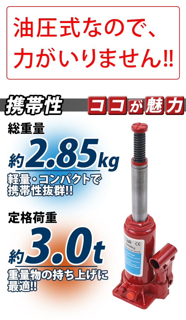 油圧式 ボトルジャッキ 定格荷重約3t 約3.0t 約3000kg 1台 単品 油圧ジャッキ だるまジャッキ ダルマジャッキ ジャッキ 手動 安全弁付き ジャッキアップ タイヤ交換 工具 小型 軽量 車載用 車 整備 修理 メンテナンス 建設 工場 作業 bjackt4043t