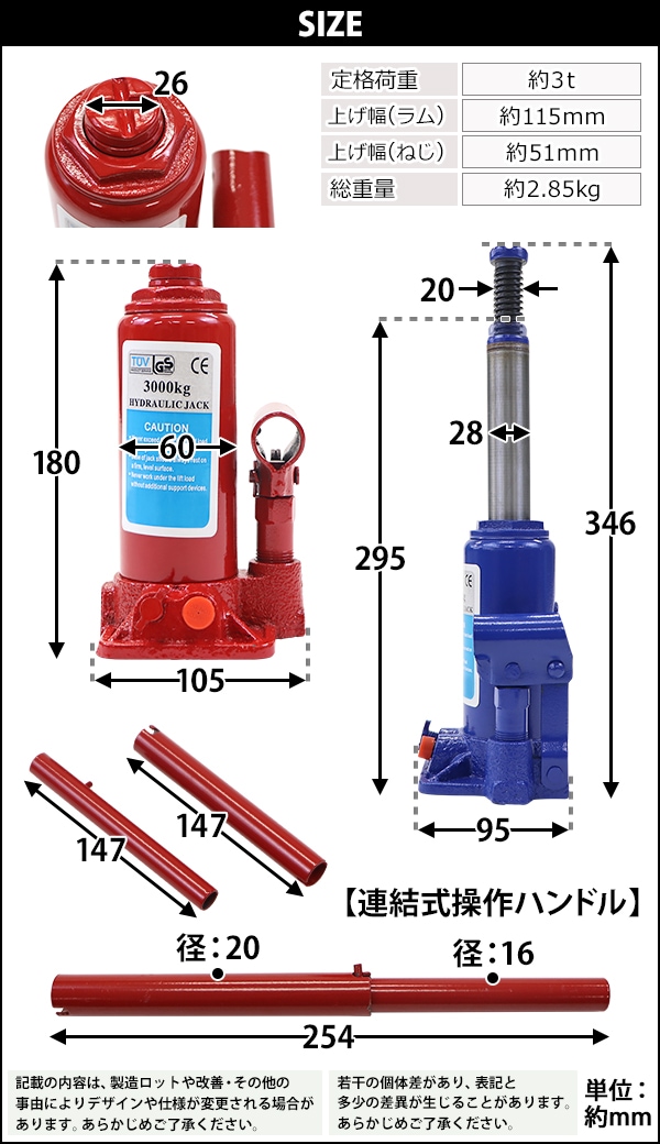 選べる2カラー 油圧式 ボトルジャッキ 定格荷重約3t 約3.0t 約3000kg 1台 単品 油圧ジャッキ だるまジャッキ ダルマジャッキ ジャッキ 手動 安全弁付き ジャッキアップ タイヤ交換 工具 小型 軽量 車載用 車 整備 修理 メンテナンス 建設 工場 作業 bjackt4043t
