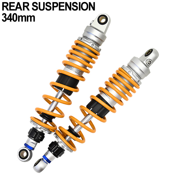 バイク 汎用 340mm リアサスペンション 左右セット イエロー スプリング リアショック リアサス 外装 カスタムパーツ モンキー 125 シート マフラー キャリア ペダル マスターシリンダー キャリパー 等バイク カスタム ドレスアップ パーツ 多数取扱中!