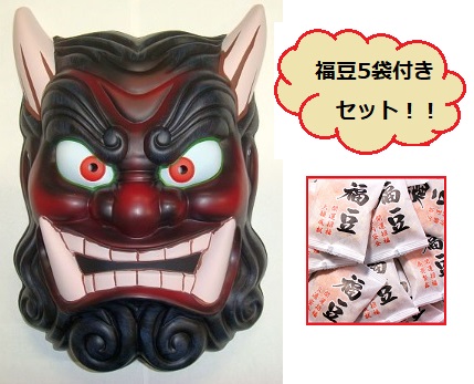 福豆5袋付 民芸品 鬼面(赤) お面 マスク お祭り ハロウィン コスプレ コスチューム 仮装 衣装 節分 豆まき 正月 縁日 子供会 くじ引き