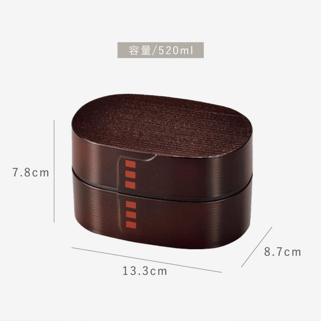 まるで木製わっぱのような質感。職人の手仕事で仕上げられた二段の塗り弁当箱です。小学生、女子中高生、大人の女性、小食な男性におすすめの520mlサイズ。