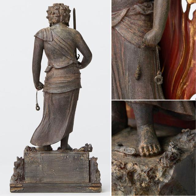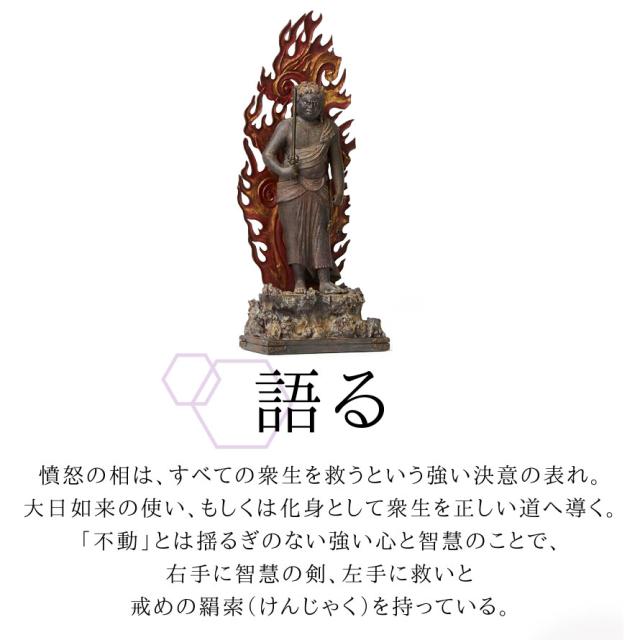 激しい憤怒相はすべての衆生を救うという強い決意の表れで、立像での表現は、迷える私たちを救わんと立ち上がった姿とも言われている。