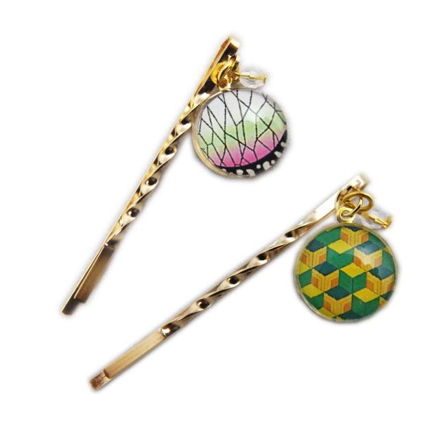 ヘアピン ガラス玉付 2点セット 黄色緑亀甲枡 白薄黄緑ピンク黒蝶の羽 きめつ 和柄 日本製 ヘアアクセサリー 女性用 レディース 子供用 キッズ