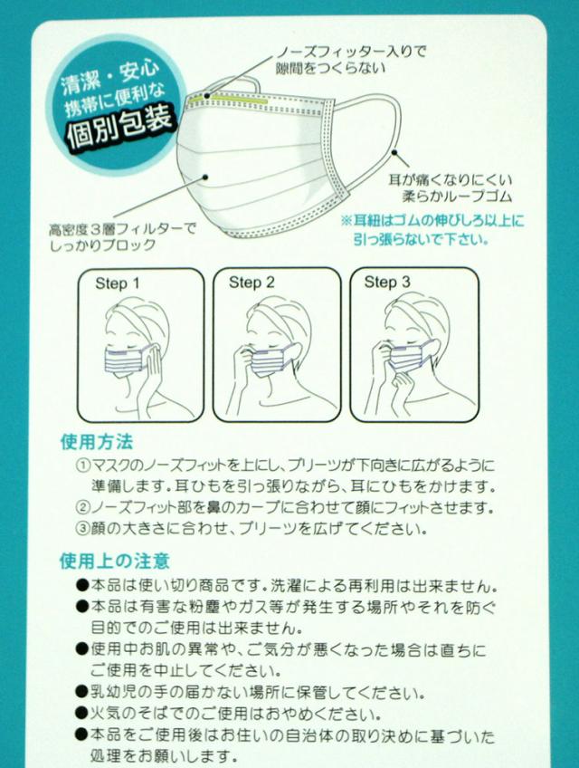 | 【サイズ】 約175mm X 約95mm 【素 材】 本体:ポリプロピレン ポリエチレン 耳紐:ポリエステル ポリウレタン ノーズフィッター:ポリエチレン 【特 長】 ・ノーズフィッター入りで 隙間をつくらない ・耳が痛くなりにくい 柔らかループゴム ・高密度3層フィルターで しっかりブロック ・使い切り商品です。 洗濯による再利用はできません。 【配送について】 1枚〜4枚まで200円(定形外orゆうパケット) 5枚〜8枚まで280円(ゆうパケット) 9枚〜12枚まで380円(クリックポスト) 13枚〜16枚まで480円(レターパック) 17枚〜20枚まで600円(レターパック) 21枚〜佐川急便620円〜 21枚以上は地域別配送料になります。 配送方法は変わる場合がございます。 【ご注意】 最大限の色表現をしておりますがモニターにより 若干色目が違う場合がありますので予めご了承ください 店頭販売・その他WEBサイトでも販売しております。 直ちに、完売処理をしておりますが 万が一ご注文が重なった場合に関しましては、 ご注文時間が早いほうを優先させていただき その商品をお届けできない場合がありますので、 ご了承ください。 |