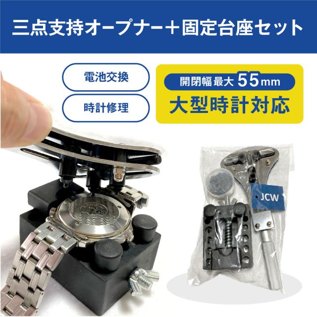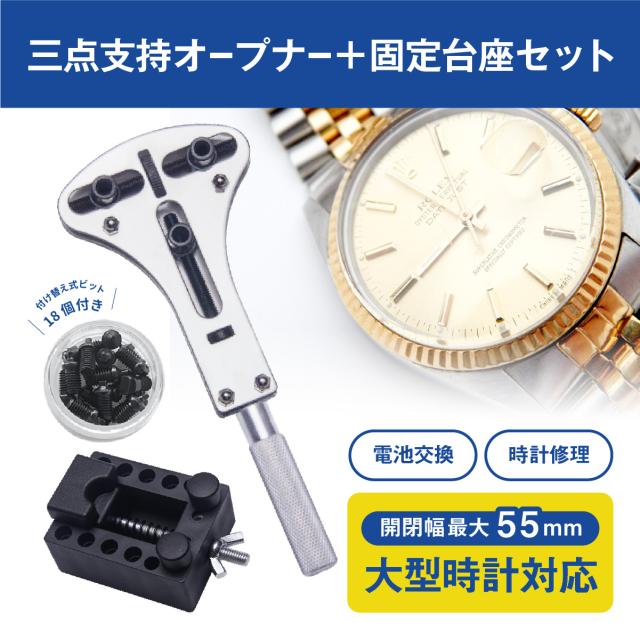 電池交換・時計修理に便利な「三点支持オープナー+固定台座」のセットです。