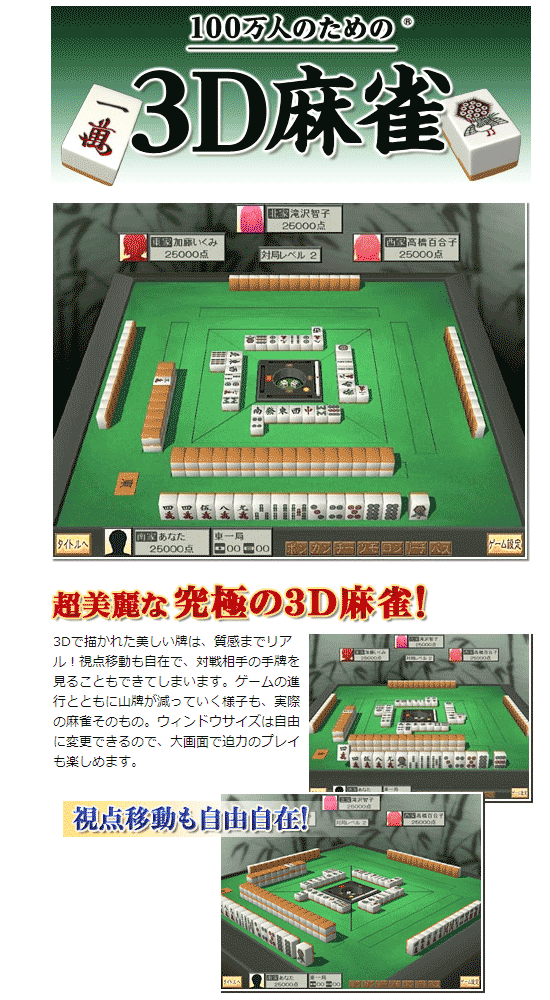 WMH352 美しくリアルなグラフィック!究極の3D麻雀!視点移動も自在で、対戦相手の手牌を見ることもできます。